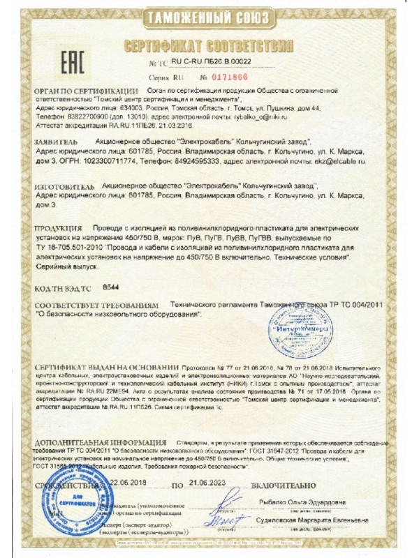 Провод с медной жилой с изоляцией из поливинилхлоридного пластиката для электрических установок на напряжение до 500В.